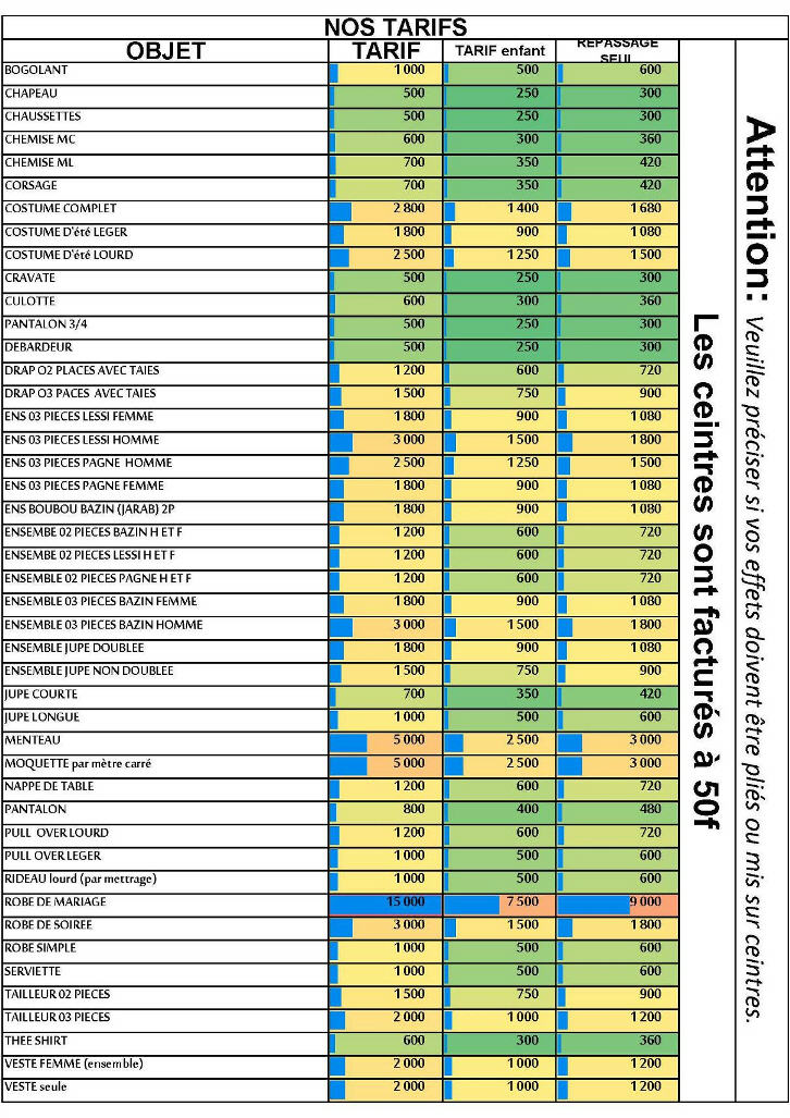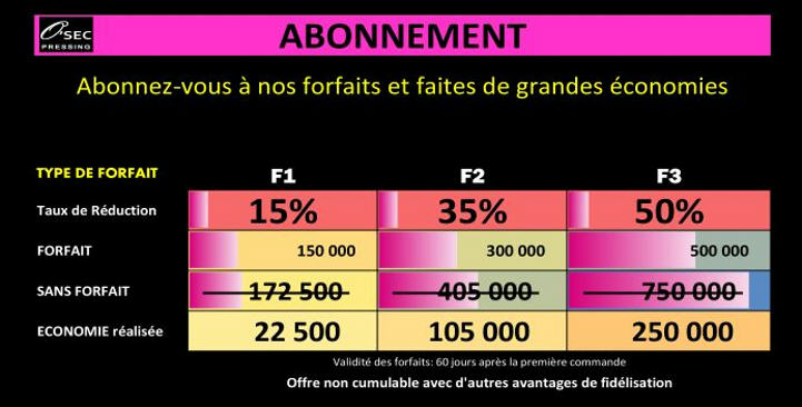 Vous êtes un gros consommateur des service de pressing...faites des économies en souscrivant à un nos forfaits. C'est simple: Vous déposez le montant d'un forfait choisi et une réduction vous est automatiquement accordée entre 15 et 50% valable tout le long de la consommation de ce forfait. Le forfait est valable 60 jours après la première commande.